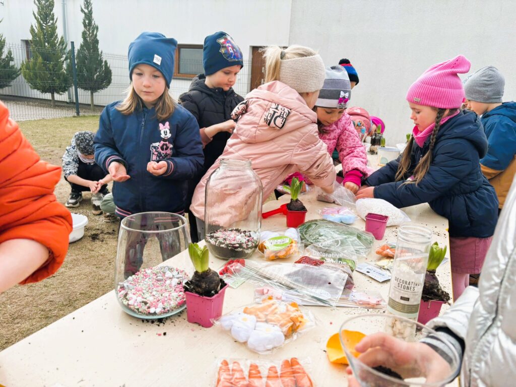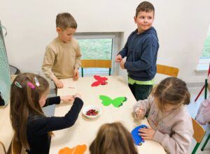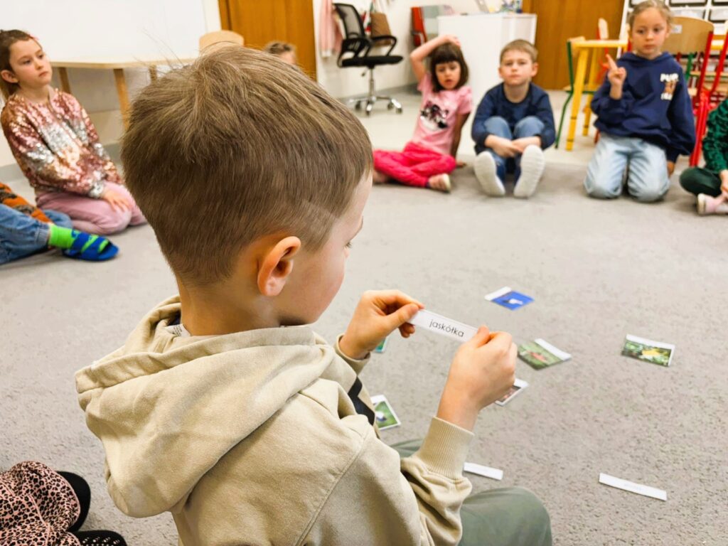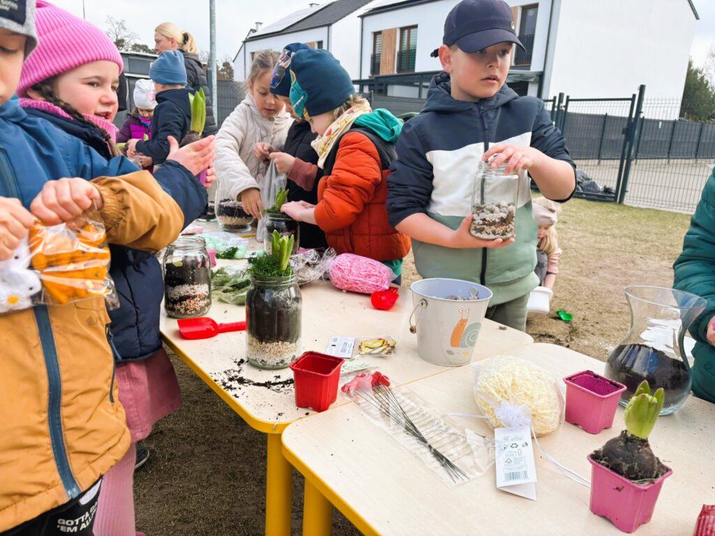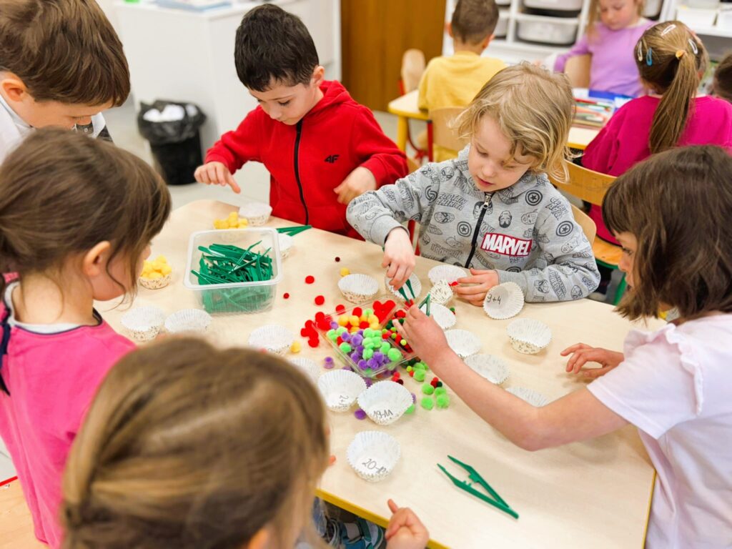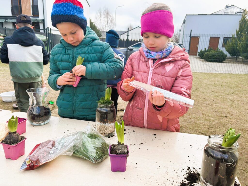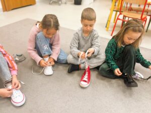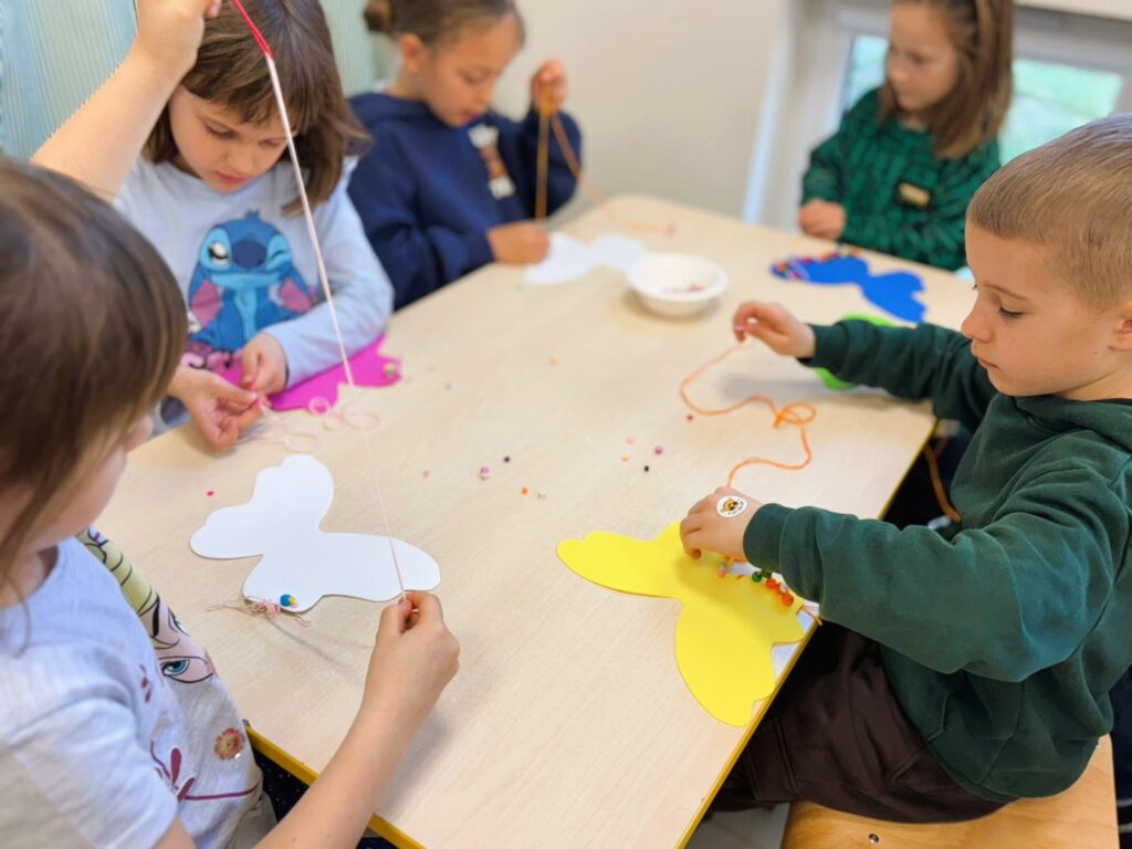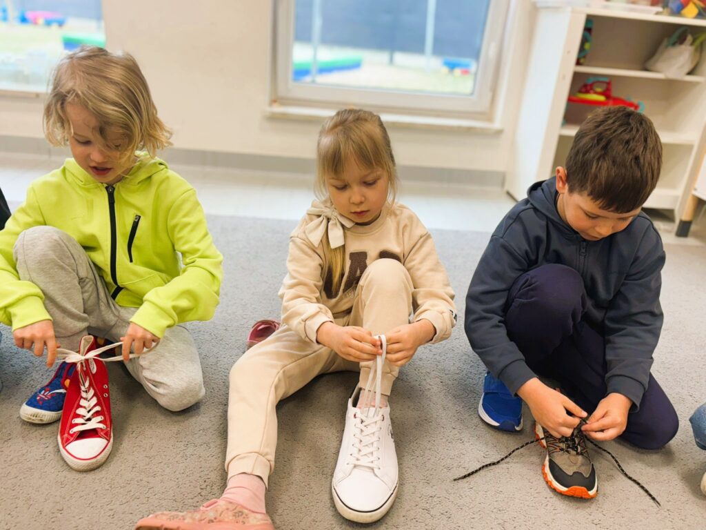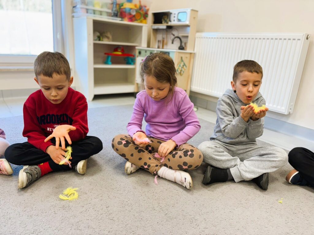 Podczas zajęć dzieci utrwalały wiedzę na temat wiosennych kwiatów i rozmawiały o oznakach nadchodzącej wiosny. W kącikach Froebla dzieci nawlekały koraliki na papierowe motyle, układały wiosenne pejzaże z darów, prowadziły badania z fasolą oraz tworzyły prace plastyczne z kwiatami. Nie zabrakło aktywności manualnych – Bystrzaki dzielnie uczyły się wiązać buty na kokardkę 🙂
