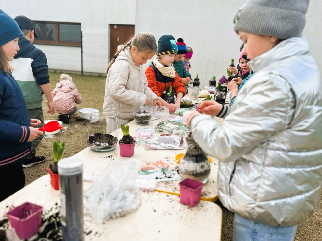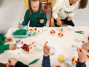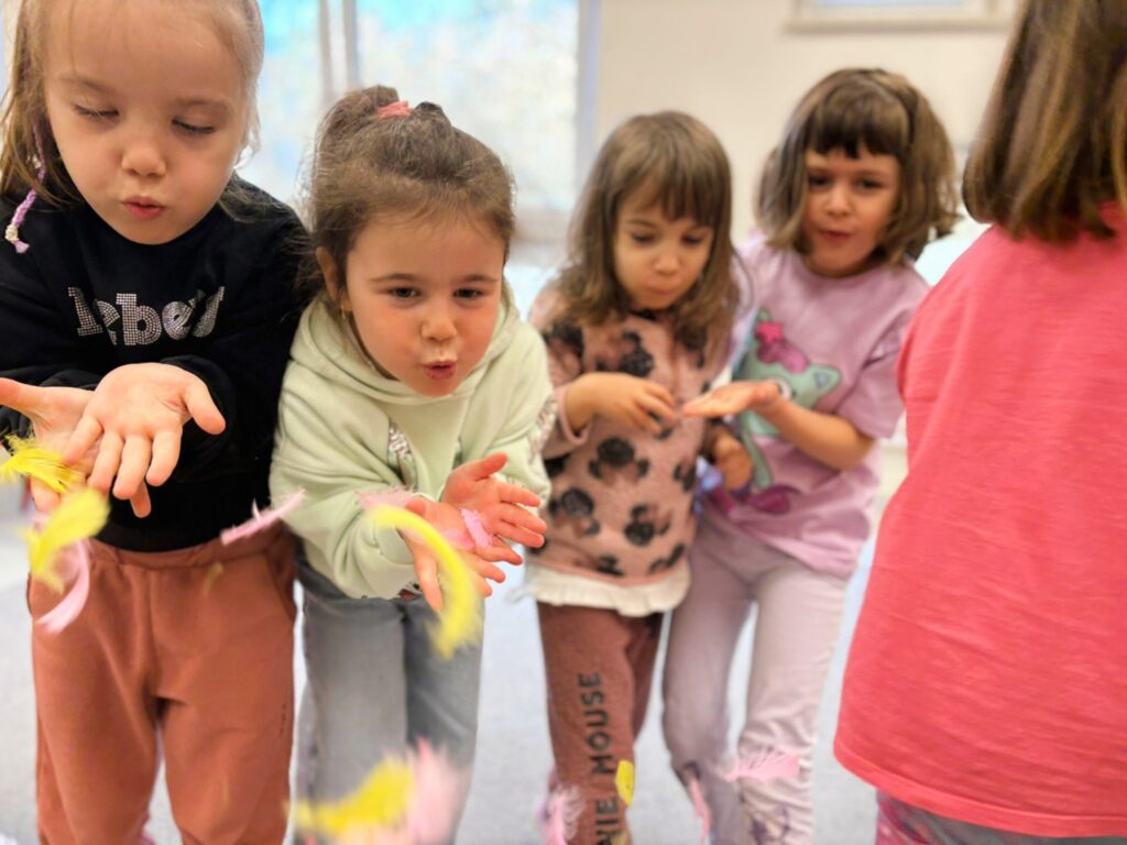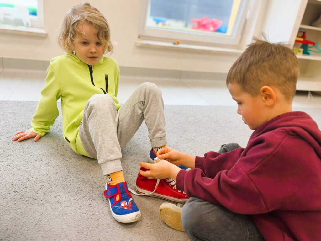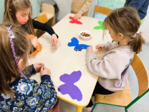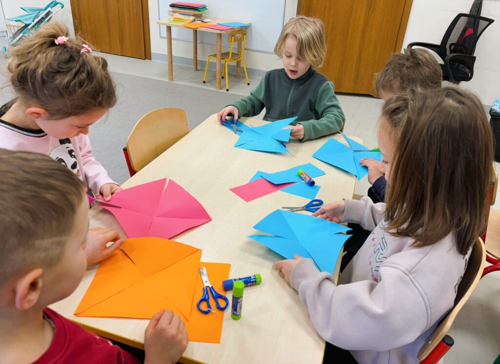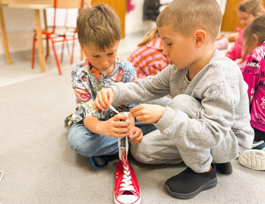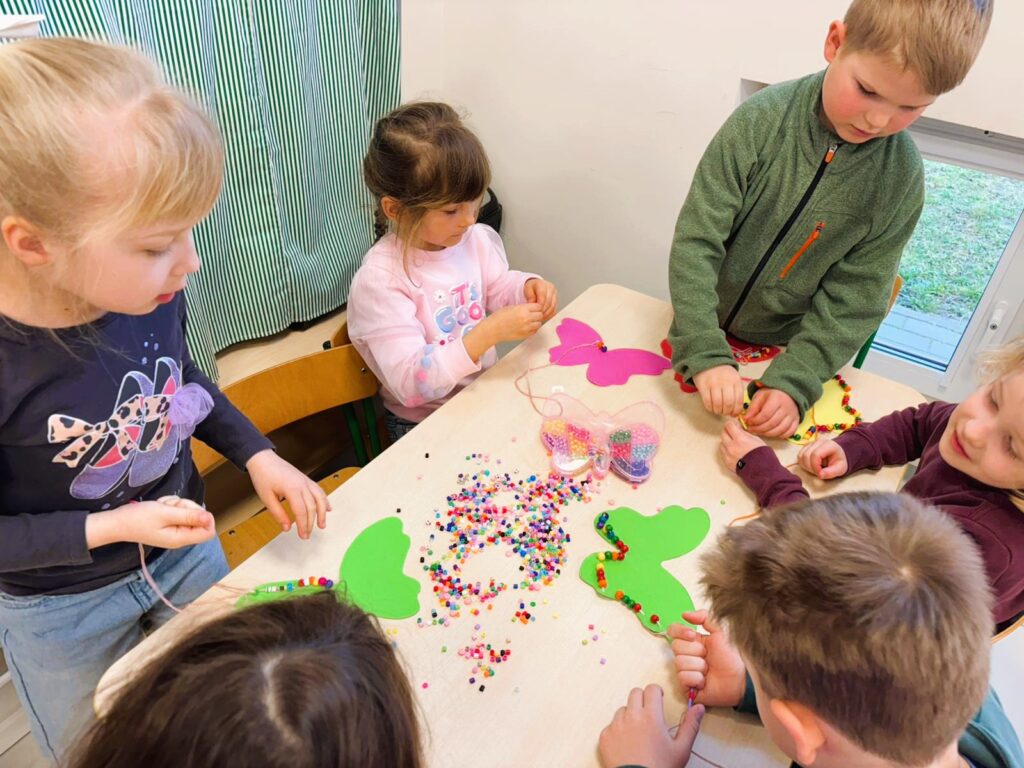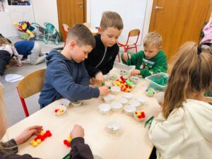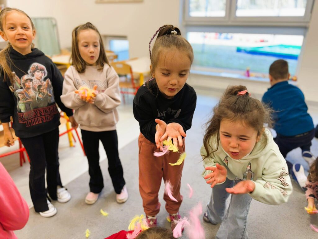 Podczas zajęć dzieci utrwalały wiedzę na temat wiosennych kwiatów i rozmawiały o oznakach nadchodzącej wiosny. W kącikach Froebla dzieci nawlekały koraliki na papierowe motyle, układały wiosenne pejzaże z darów, prowadziły badania z fasolą oraz tworzyły prace plastyczne z kwiatami. Nie zabrakło aktywności manualnych – Bystrzaki dzielnie uczyły się wiązać buty na kokardkę 🙂