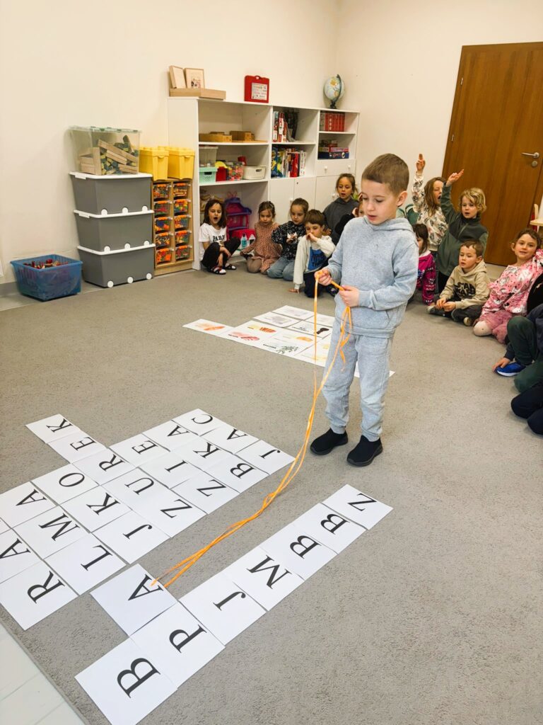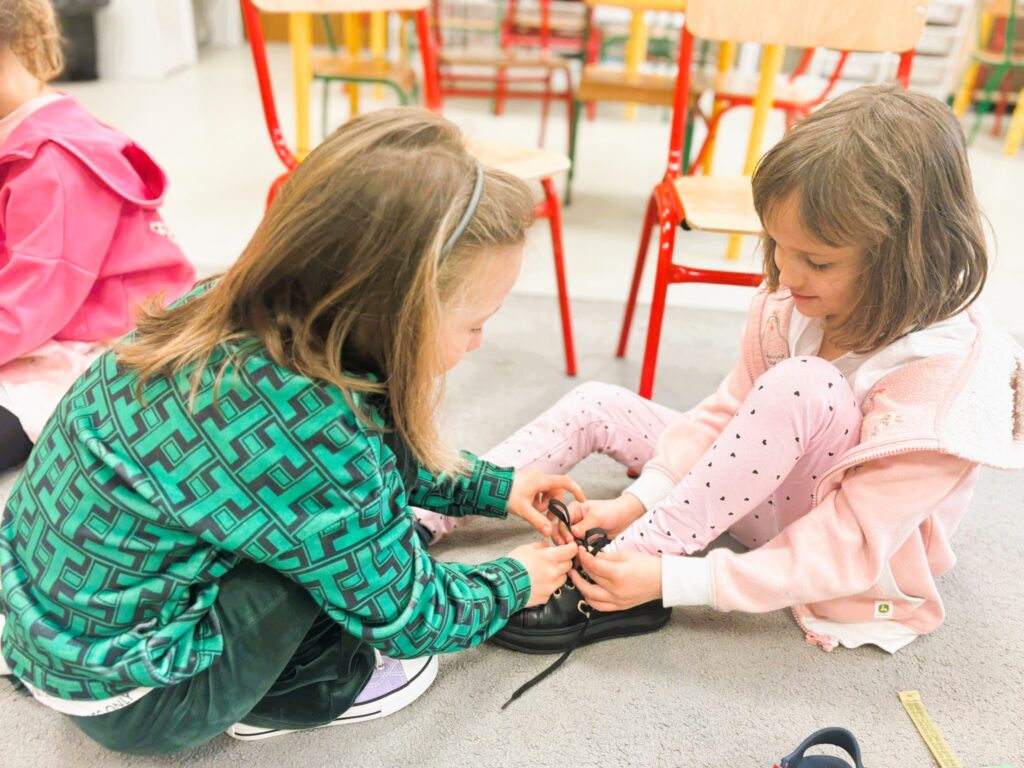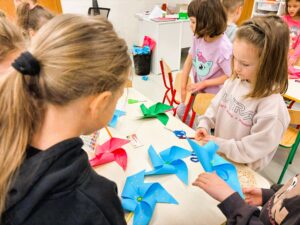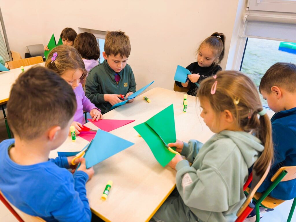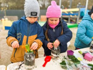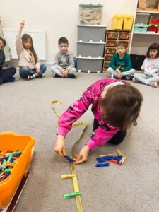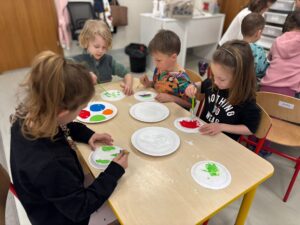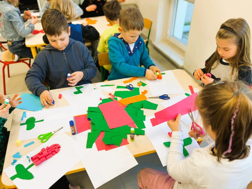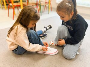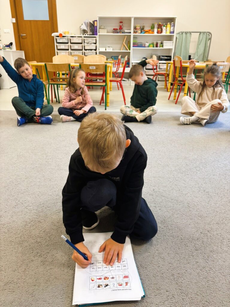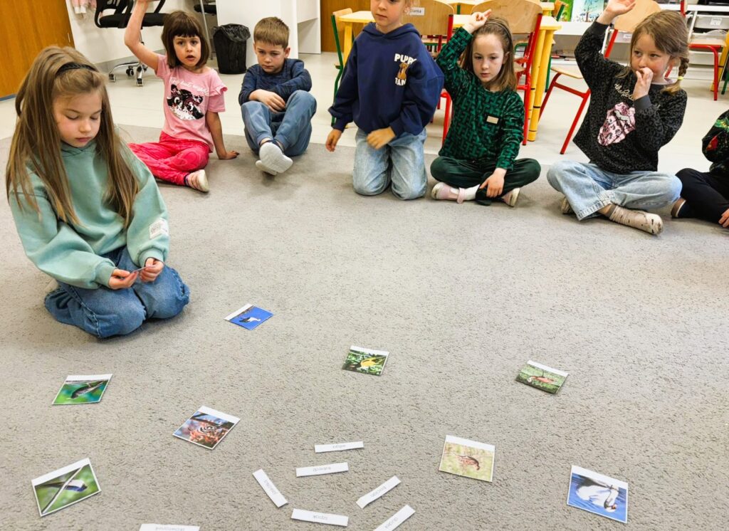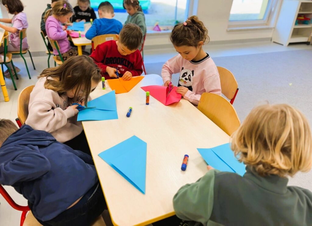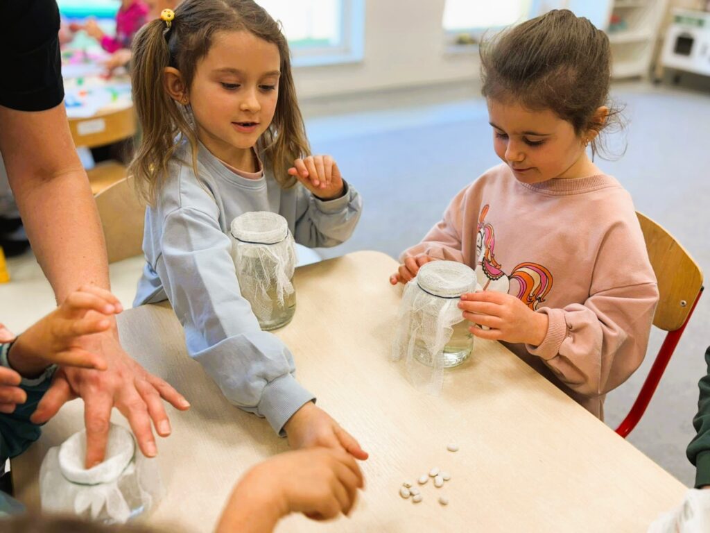 Podczas zajęć dzieci utrwalały wiedzę na temat wiosennych kwiatów i rozmawiały o oznakach nadchodzącej wiosny. W kącikach Froebla dzieci nawlekały koraliki na papierowe motyle, układały wiosenne pejzaże z darów, prowadziły badania z fasolą oraz tworzyły prace plastyczne z kwiatami. Nie zabrakło aktywności manualnych – Bystrzaki dzielnie uczyły się wiązać buty na kokardkę 🙂