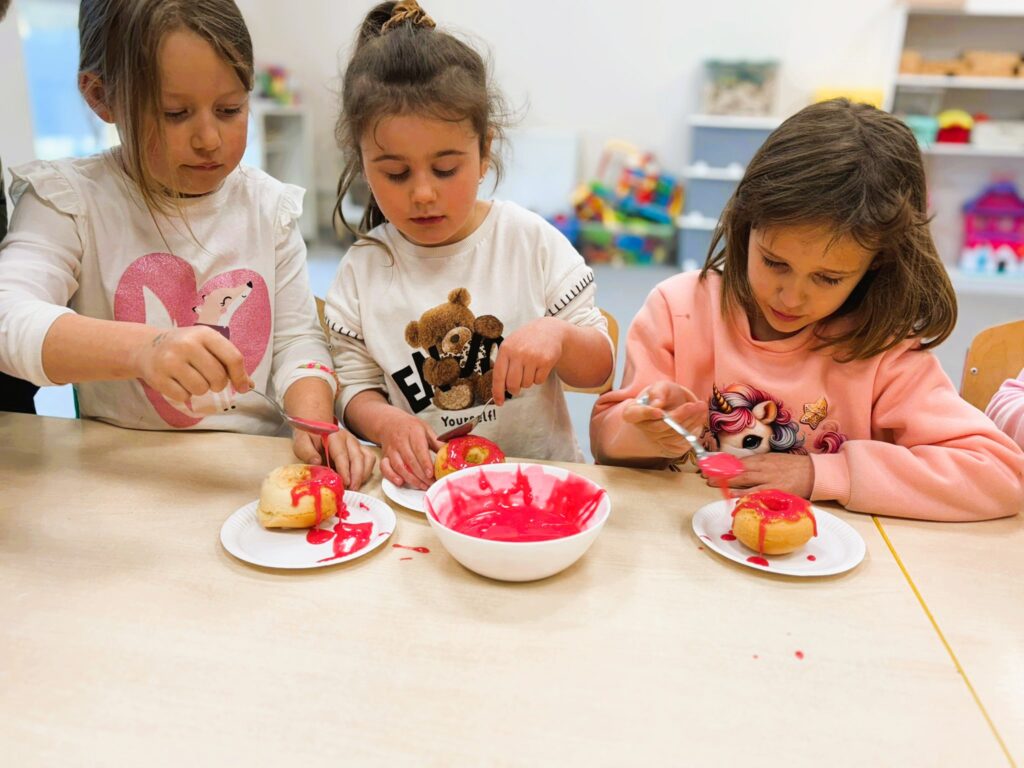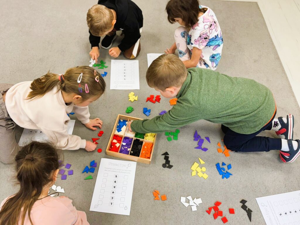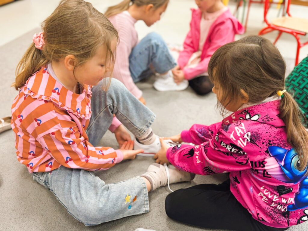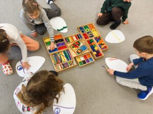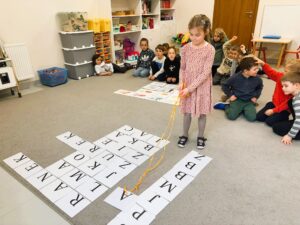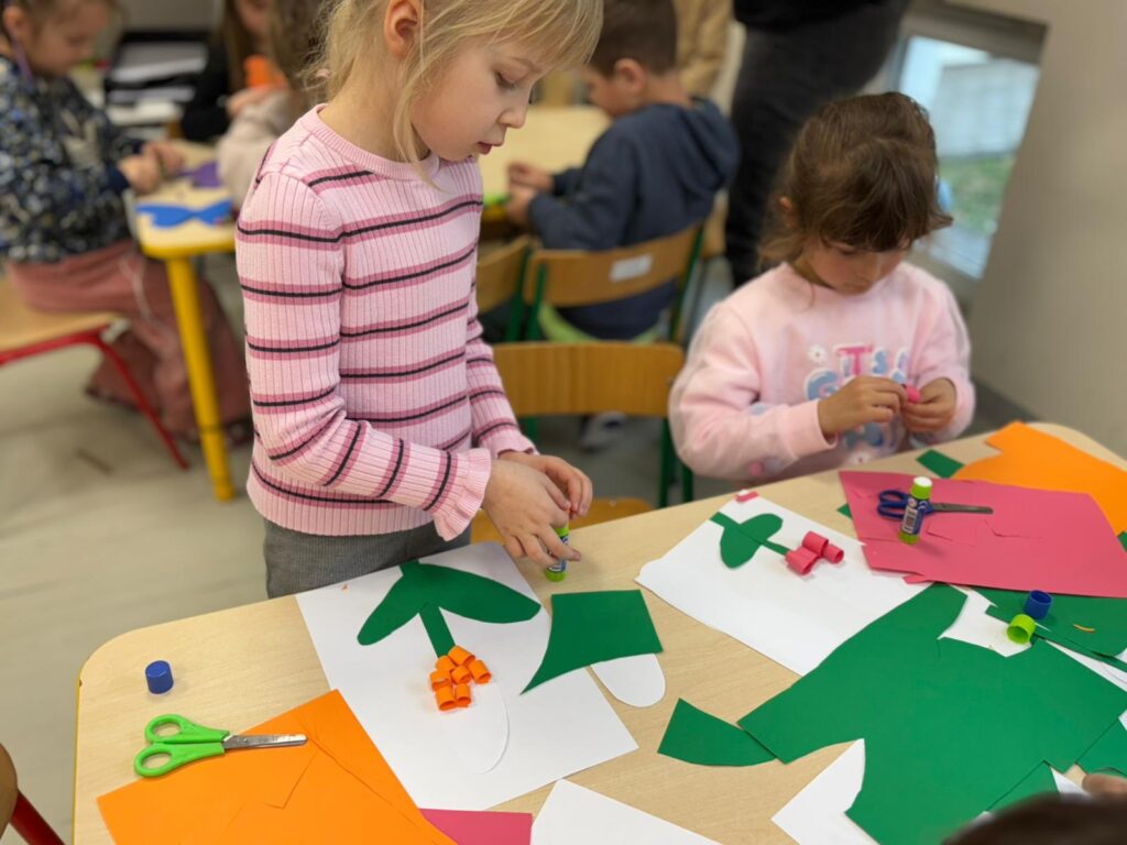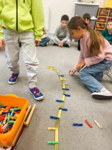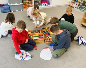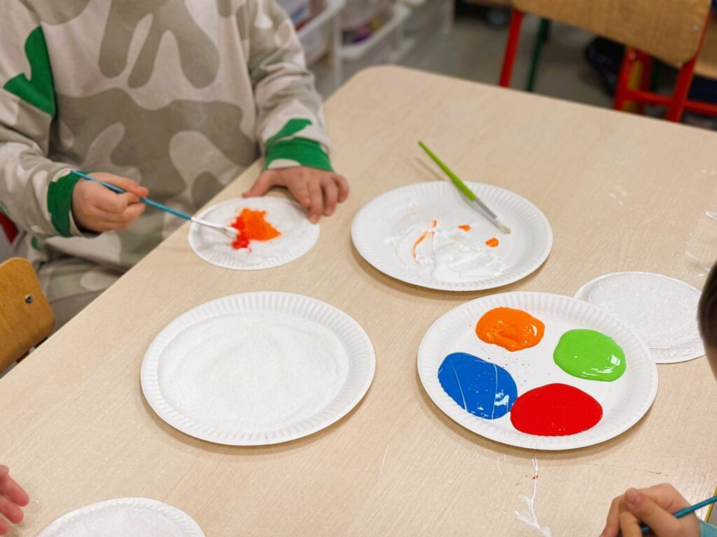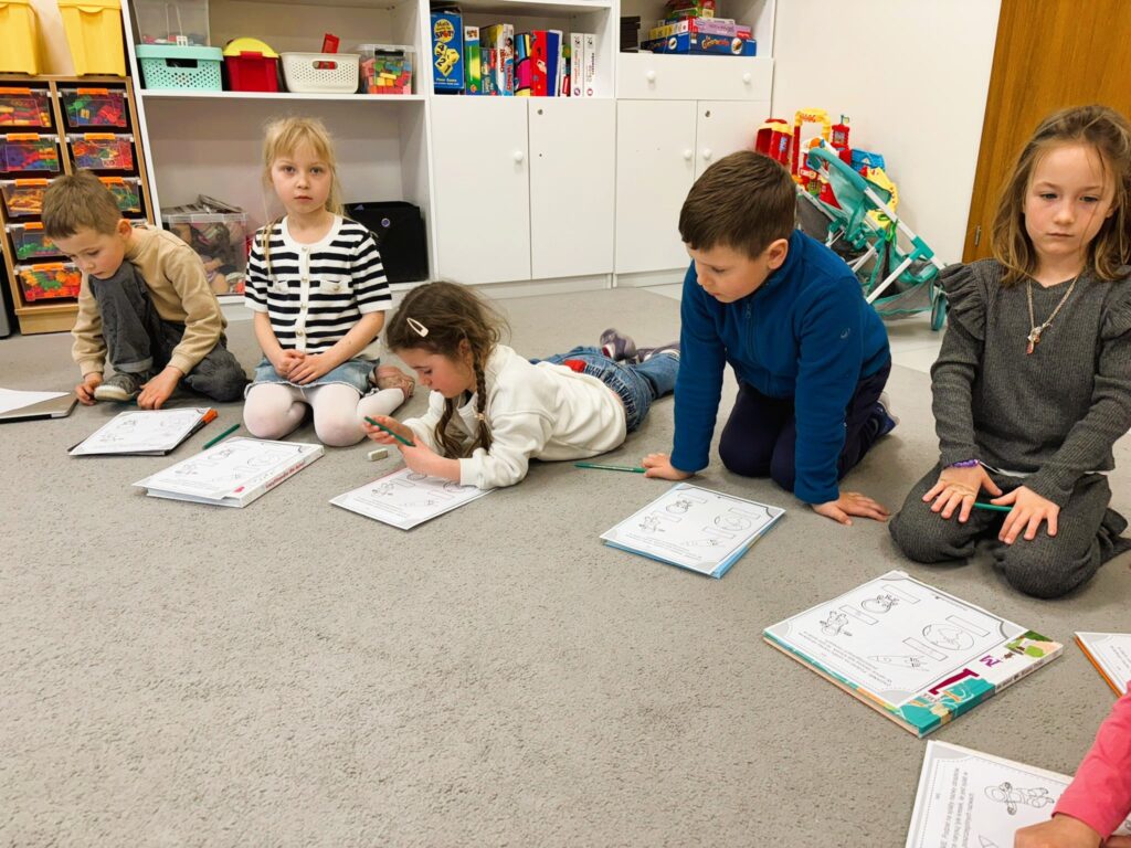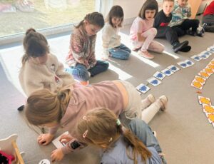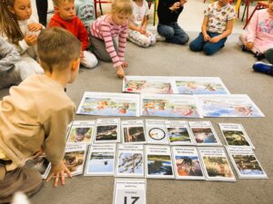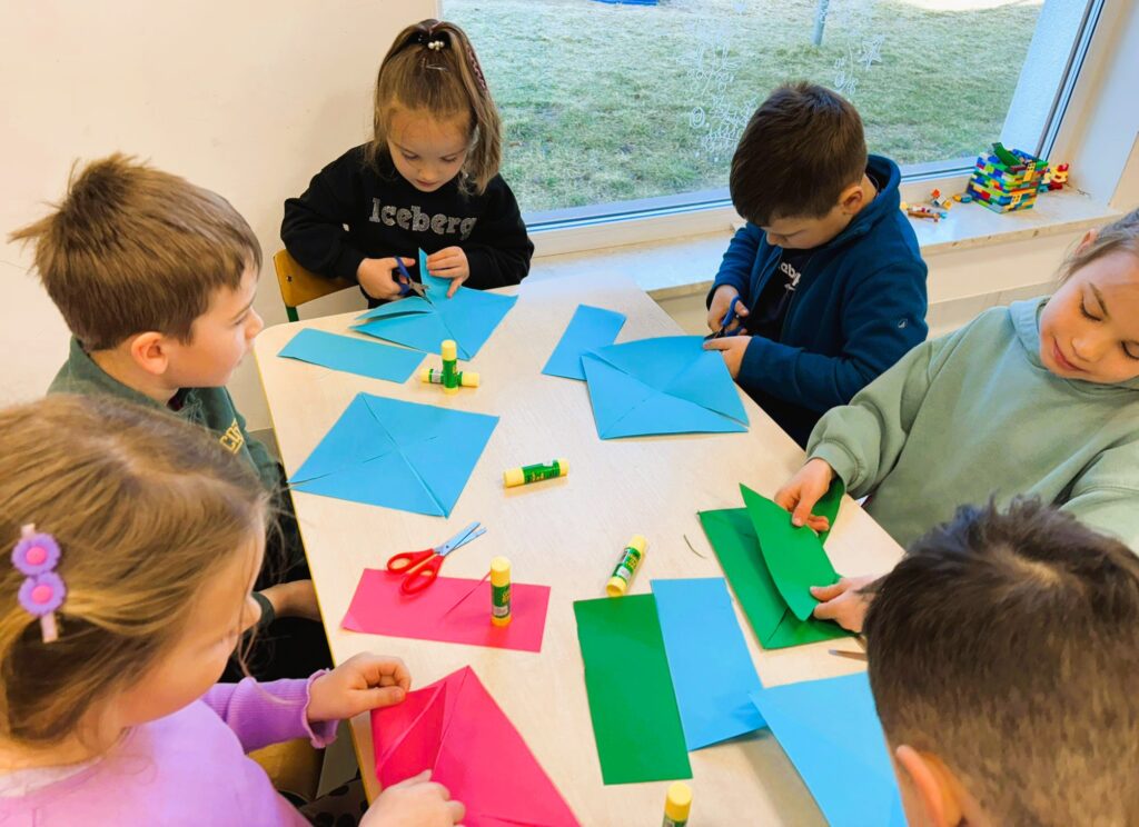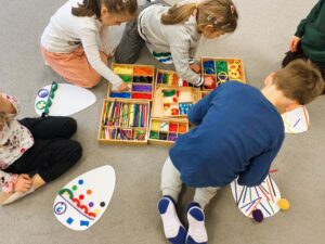 Podczas zajęć dzieci utrwalały wiedzę na temat wiosennych kwiatów i rozmawiały o oznakach nadchodzącej wiosny. W kącikach Froebla dzieci nawlekały koraliki na papierowe motyle, układały wiosenne pejzaże z darów, prowadziły badania z fasolą oraz tworzyły prace plastyczne z kwiatami. Nie zabrakło aktywności manualnych – Bystrzaki dzielnie uczyły się wiązać buty na kokardkę 🙂