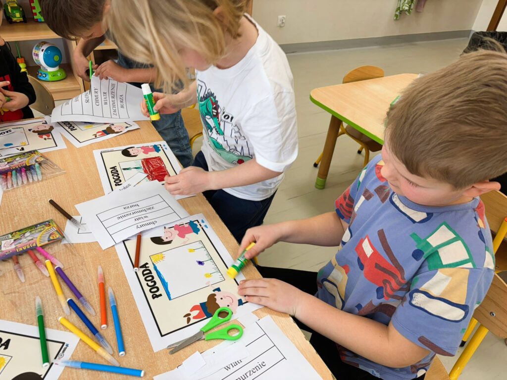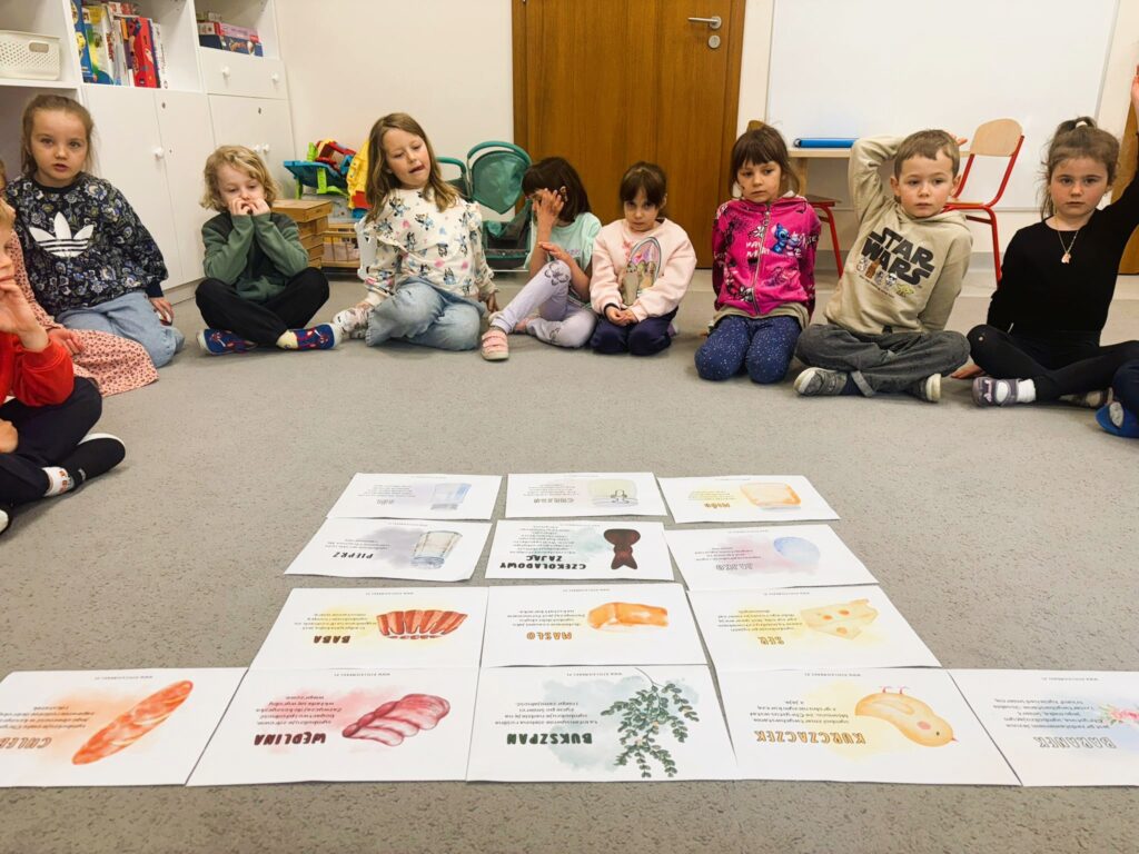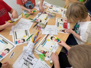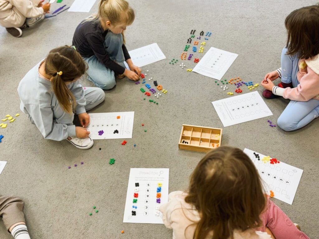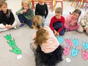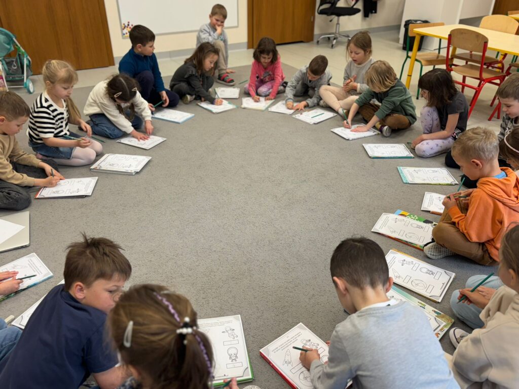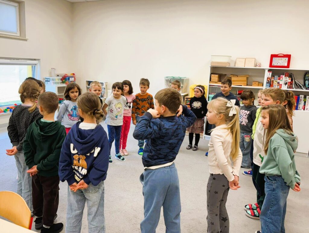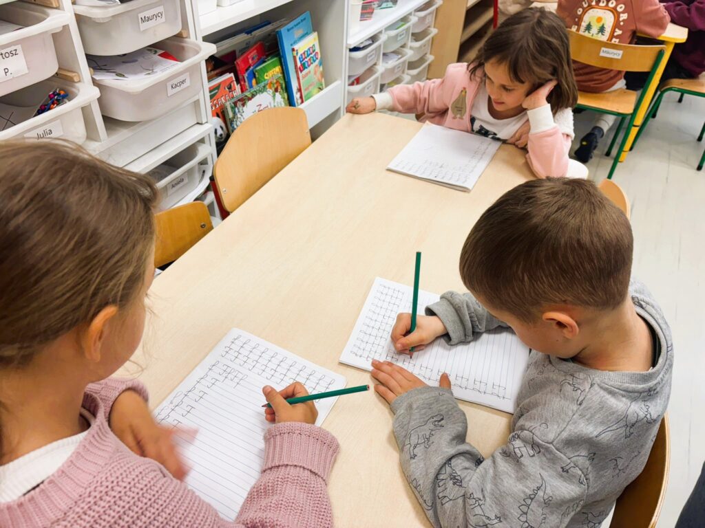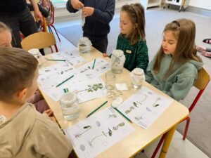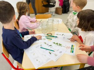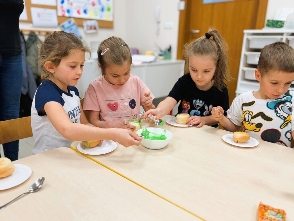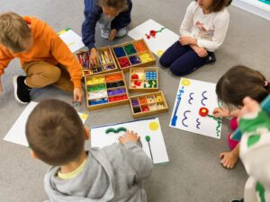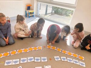 Podczas zajęć dzieci utrwalały wiedzę na temat wiosennych kwiatów i rozmawiały o oznakach nadchodzącej wiosny. W kącikach Froebla dzieci nawlekały koraliki na papierowe motyle, układały wiosenne pejzaże z darów, prowadziły badania z fasolą oraz tworzyły prace plastyczne z kwiatami. Nie zabrakło aktywności manualnych – Bystrzaki dzielnie uczyły się wiązać buty na kokardkę 🙂
