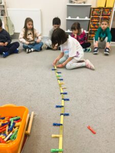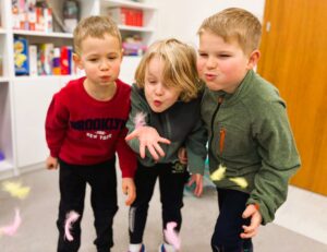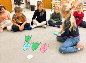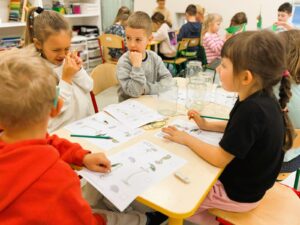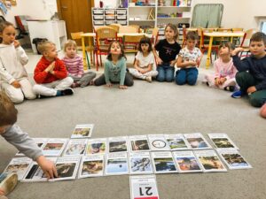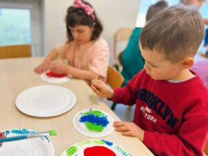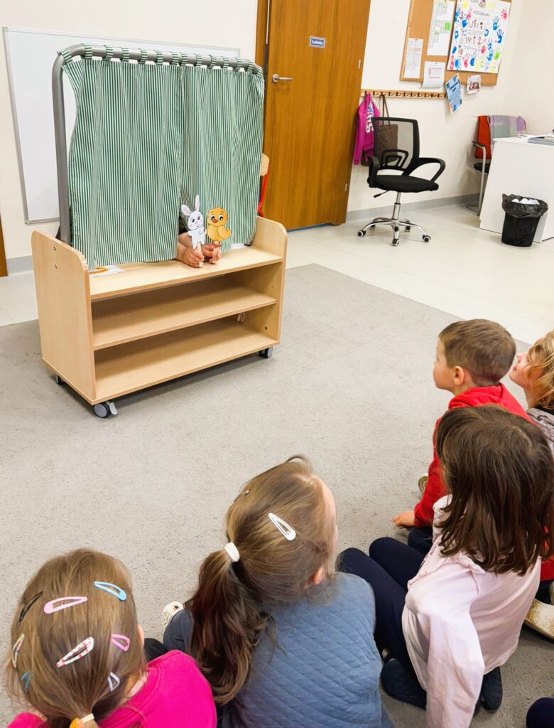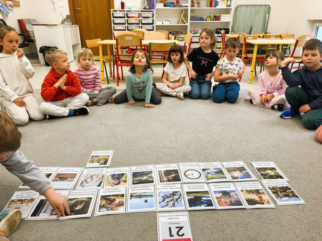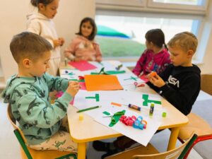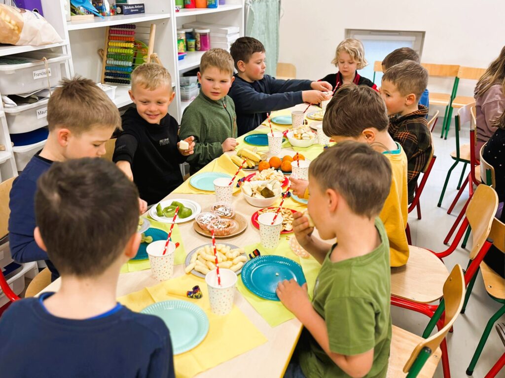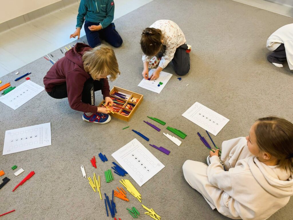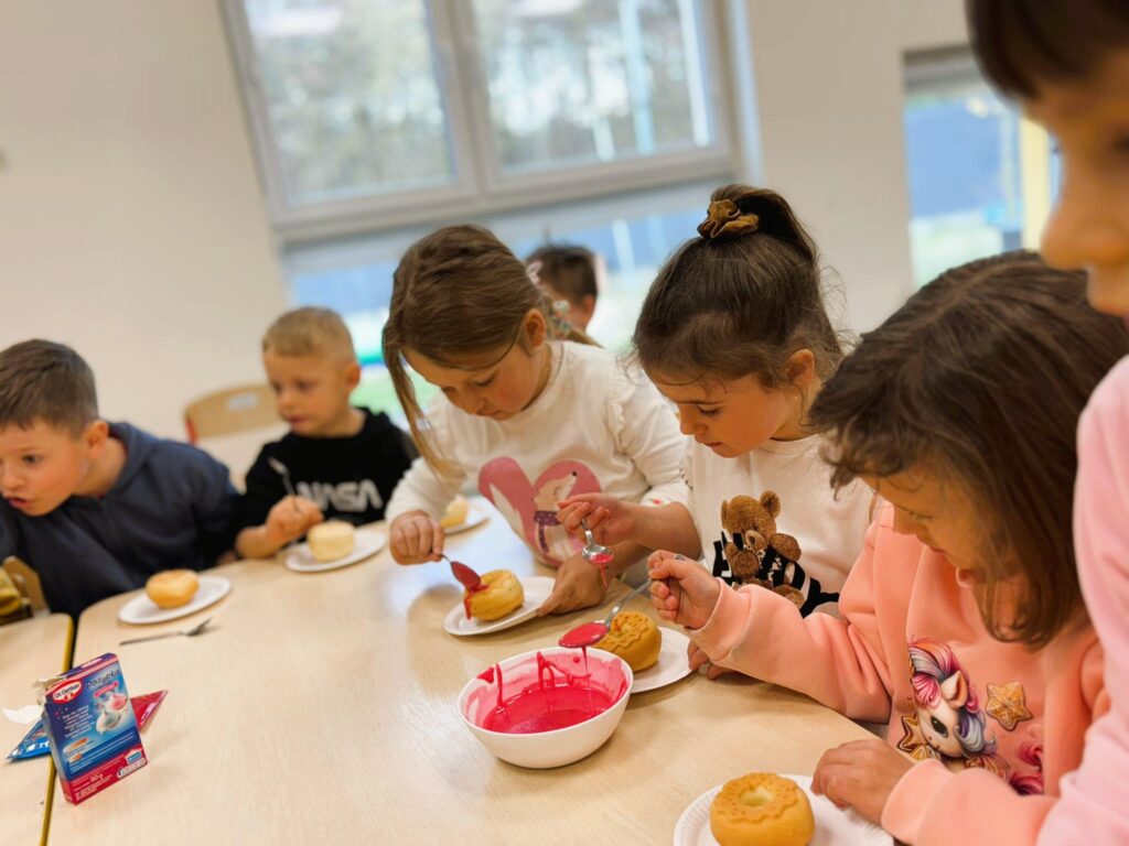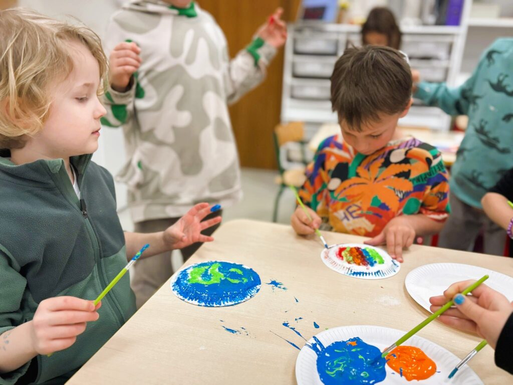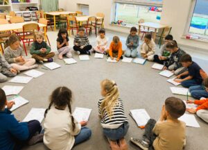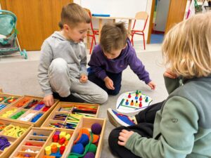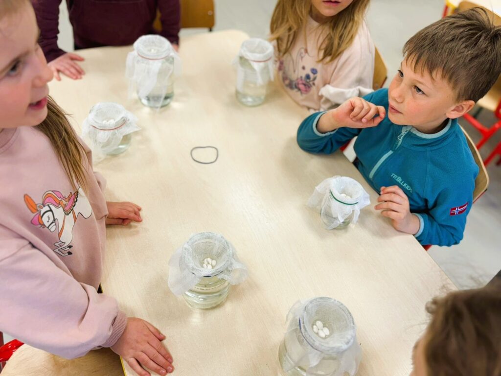Podczas zajęć dzieci utrwalały wiedzę na temat wiosennych kwiatów i rozmawiały o oznakach nadchodzącej wiosny. W kącikach Froebla dzieci nawlekały koraliki na papierowe motyle, układały wiosenne pejzaże z darów, prowadziły badania z fasolą oraz tworzyły prace plastyczne z kwiatami. Nie zabrakło aktywności manualnych – Bystrzaki dzielnie uczyły się wiązać buty na kokardkę 🙂
