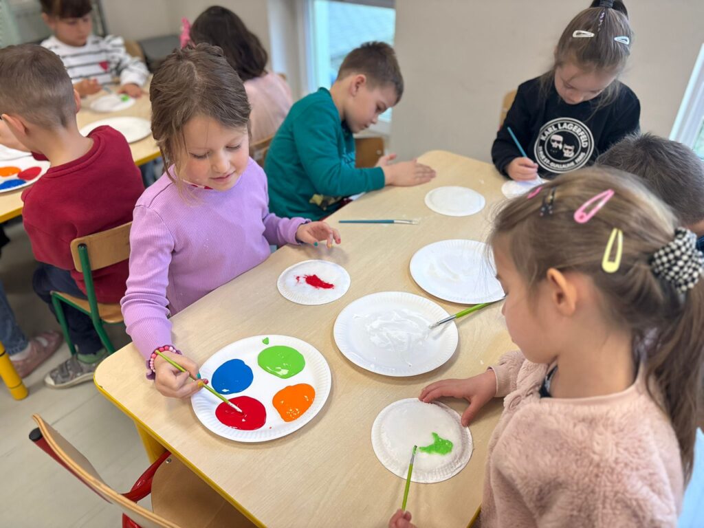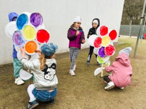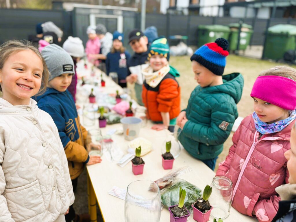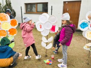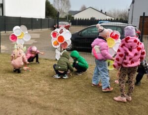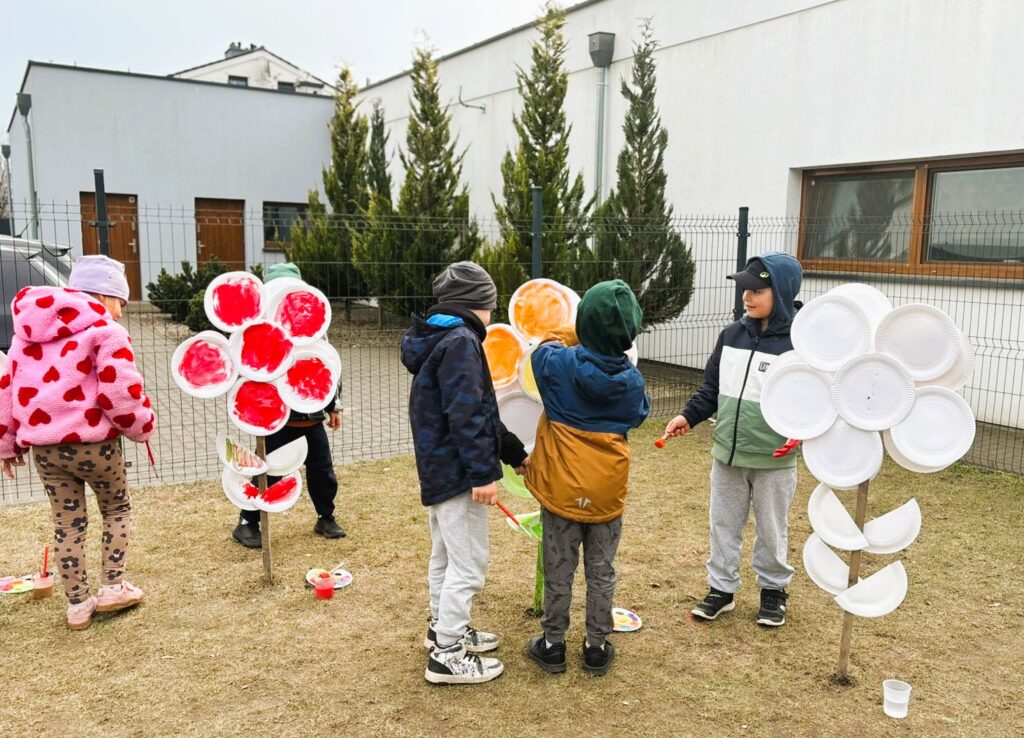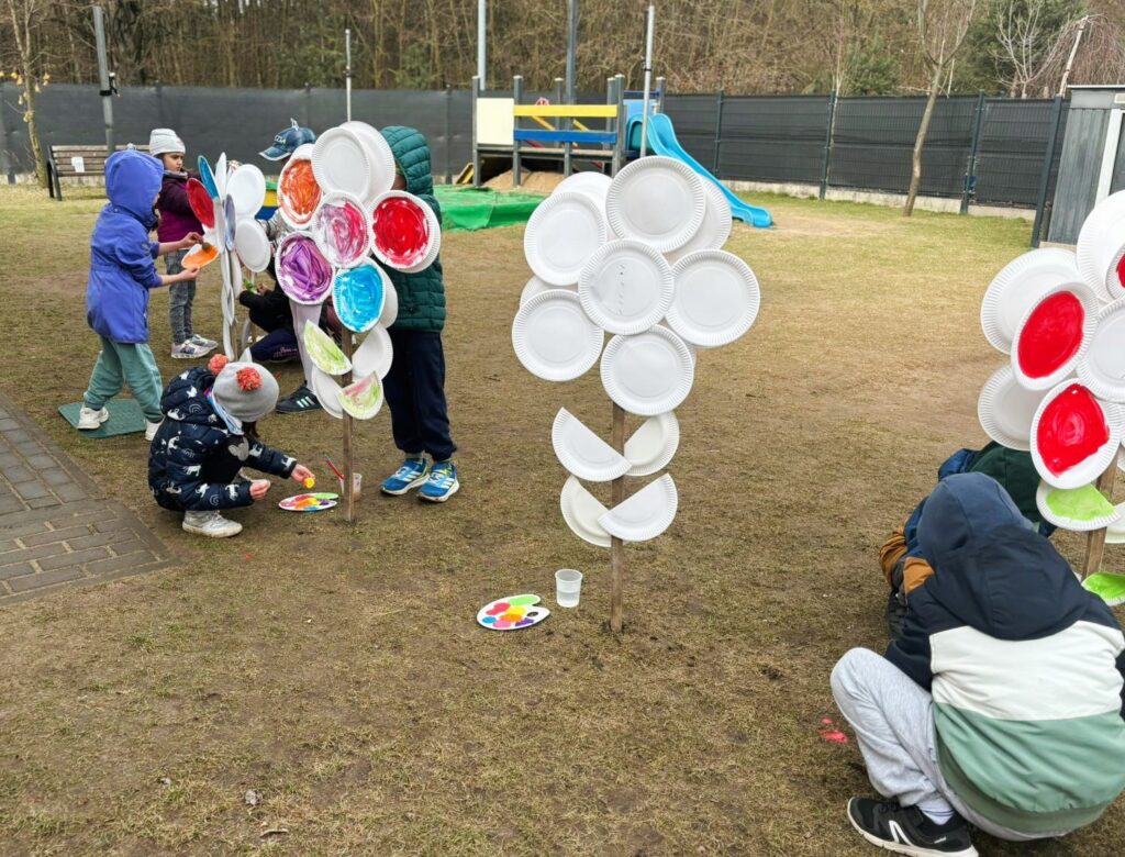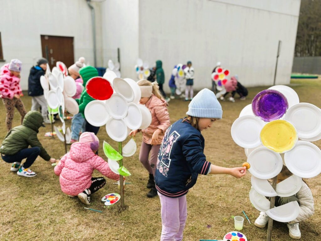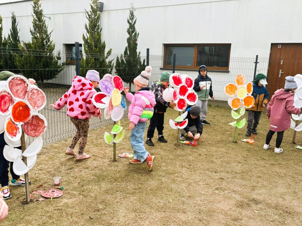 Z okazji pierwszego dnia wiosny Bystrzaki zamieniły przedszkolny ogród w prawdziwie kolorową łąkę! Dzieci z zaangażowaniem malowały papierowe kwiaty, tworząc radosny i iście wiosenny klimat.