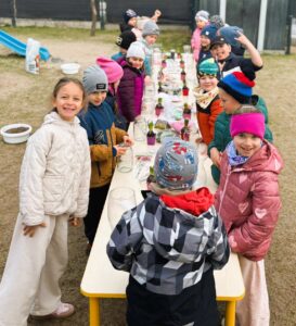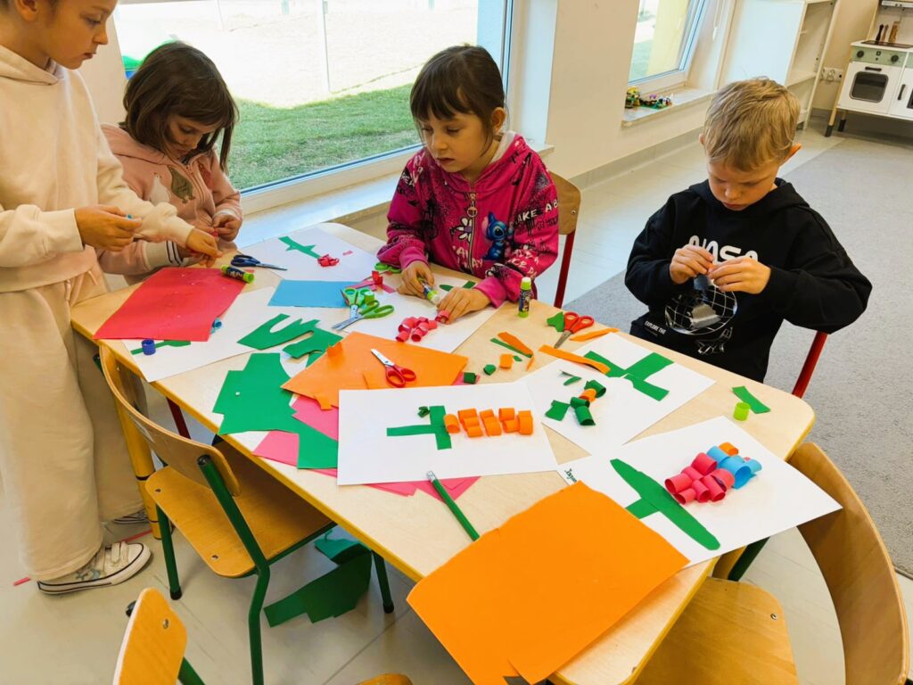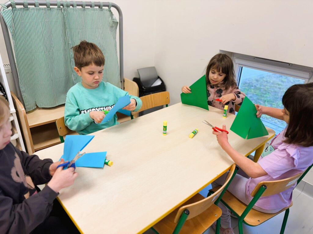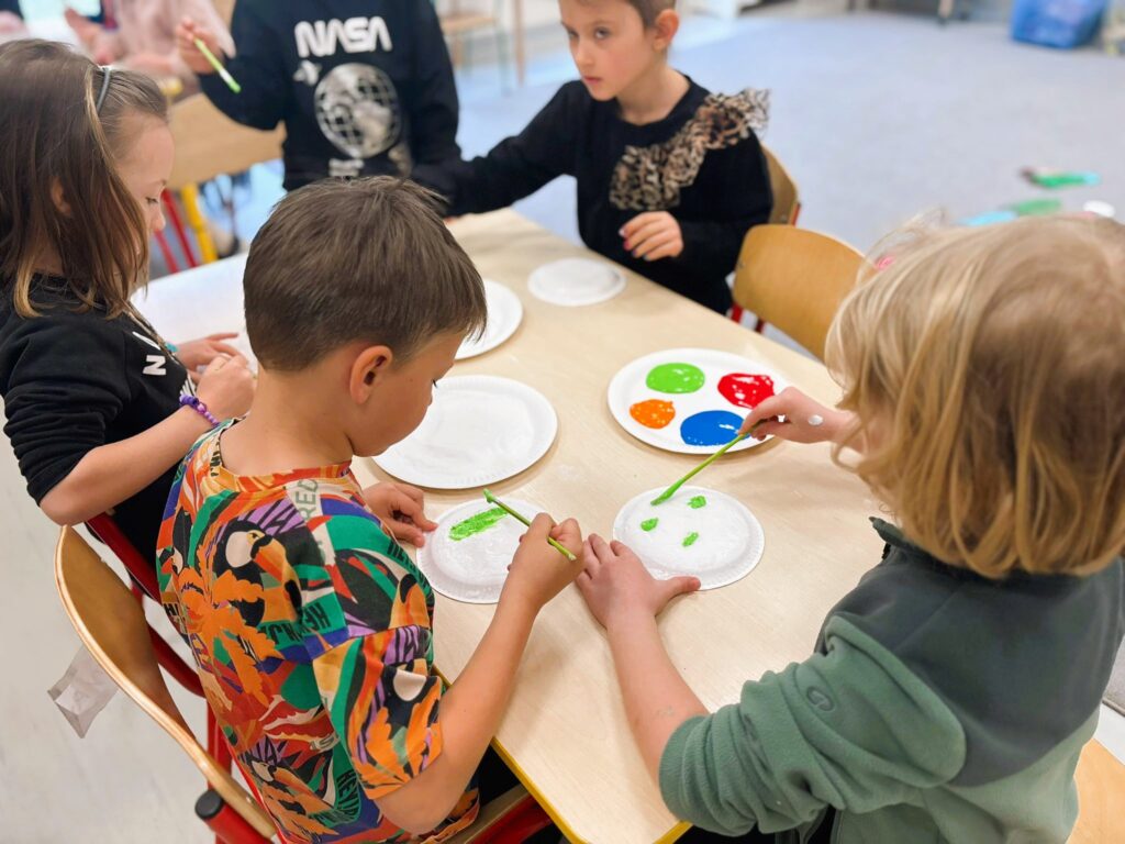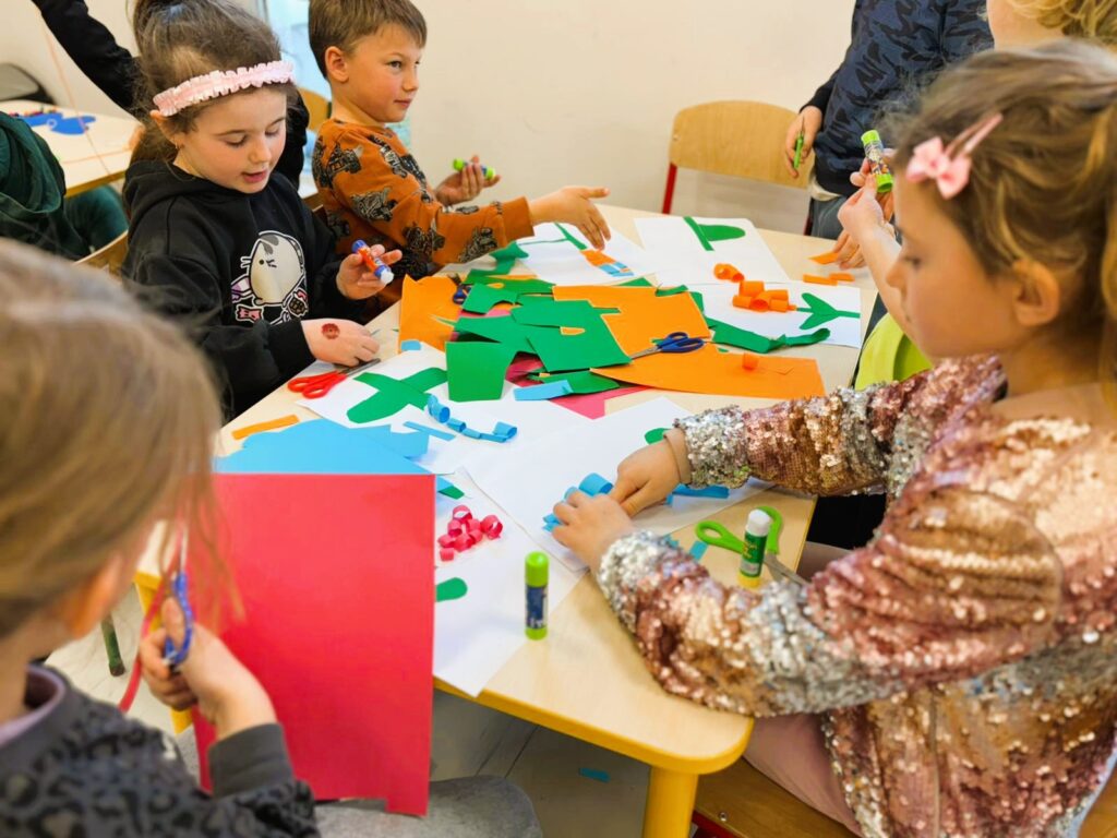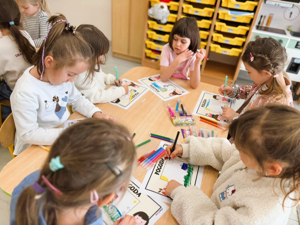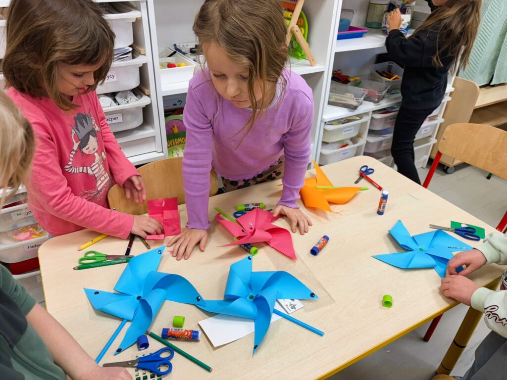 Z okazji pierwszego dnia wiosny Bystrzaki zamieniły przedszkolny ogród w prawdziwie kolorową łąkę! Dzieci z zaangażowaniem malowały papierowe kwiaty, tworząc radosny i iście wiosenny klimat.