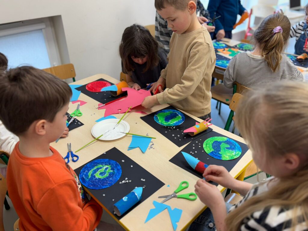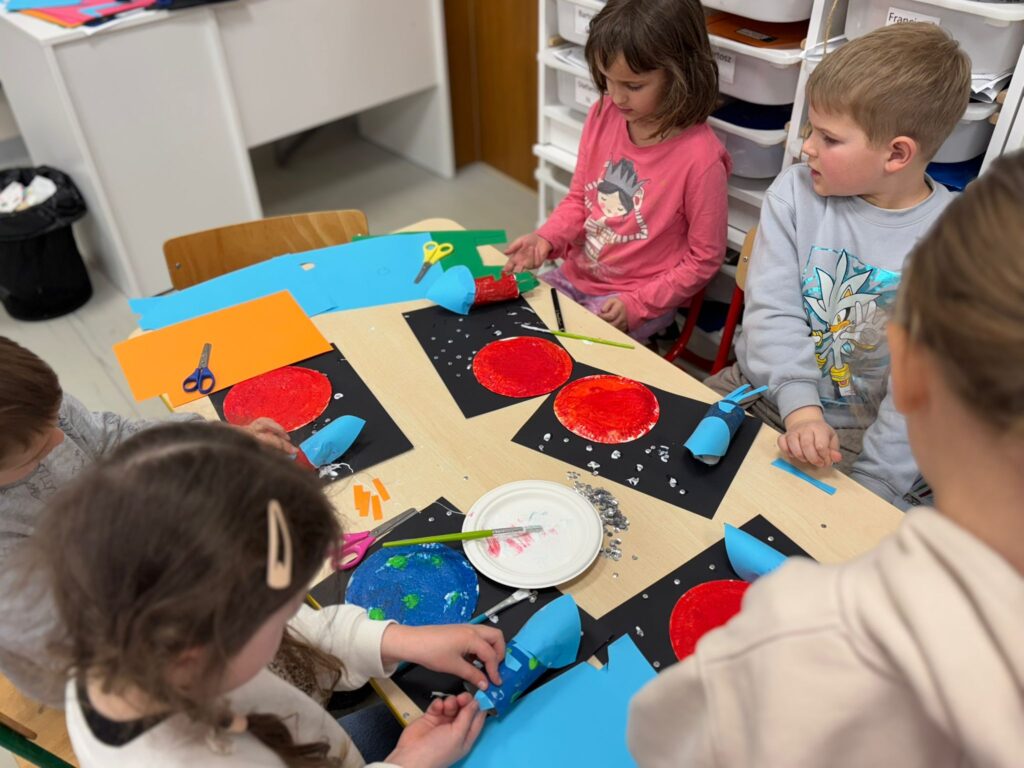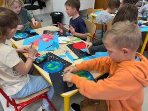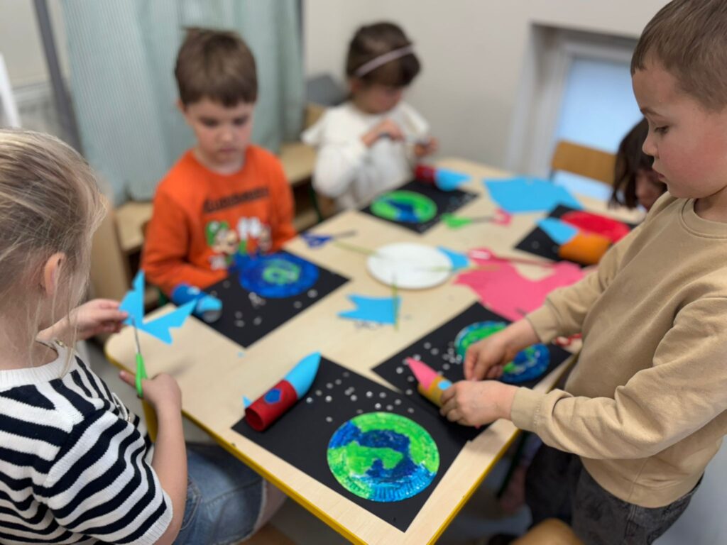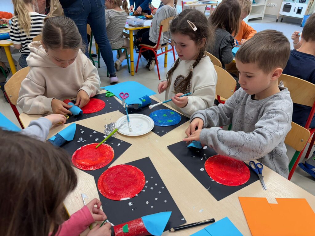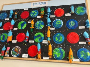 Bystrzaki na zajęciach przeniosły się w kosmiczną podróż! Dzieci wykonywały matematyczne działania z rakietami, stworzyły wiatraki metodą origami. Powstały także wyjątkowe prace plastyczne przedstawiające planety.