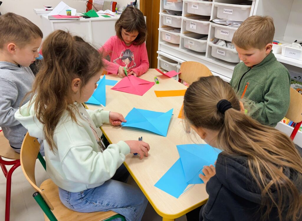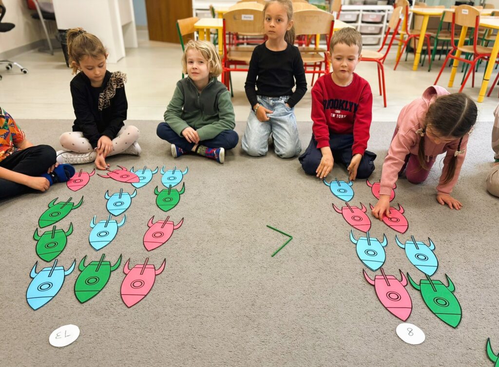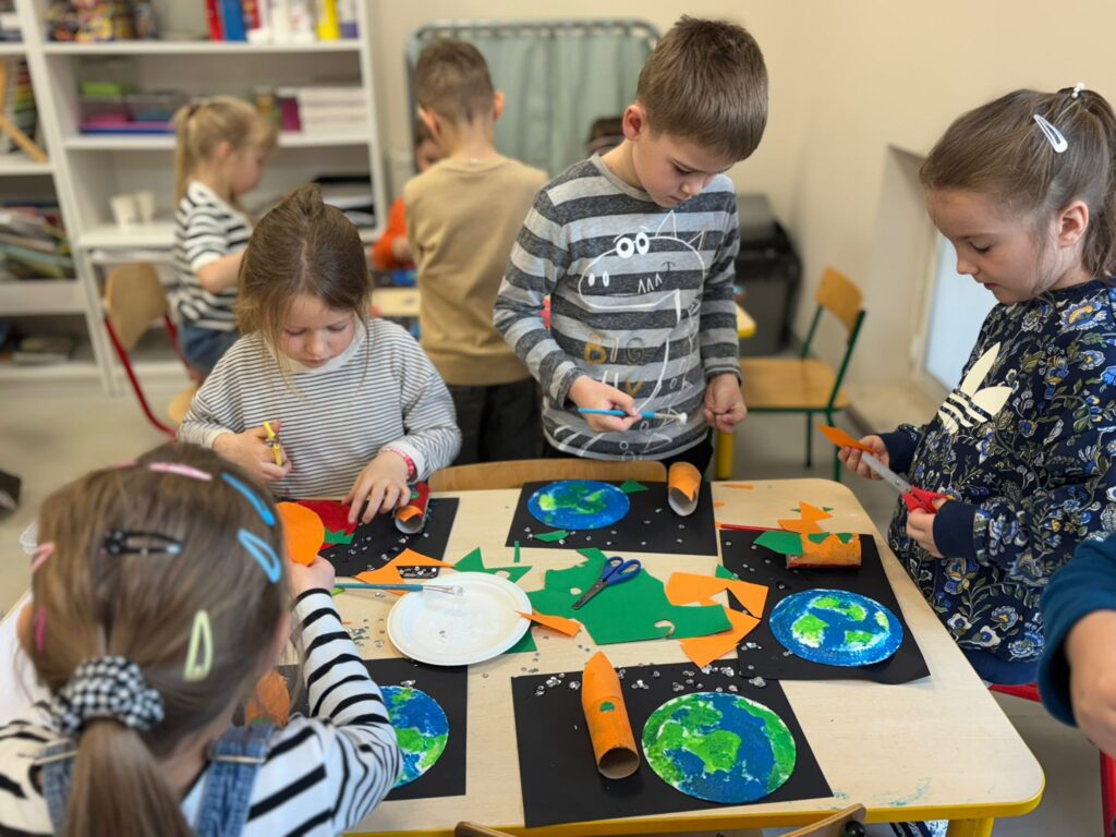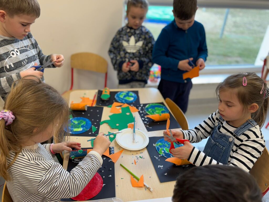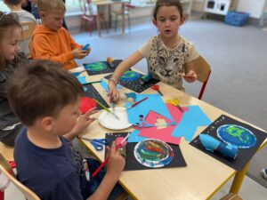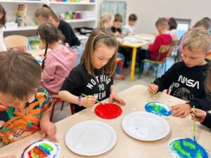 Bystrzaki na zajęciach przeniosły się w kosmiczną podróż! Dzieci wykonywały matematyczne działania z rakietami, stworzyły wiatraki metodą origami. Powstały także wyjątkowe prace plastyczne przedstawiające planety.