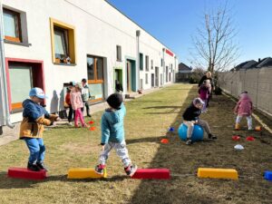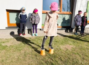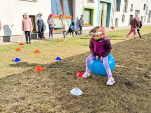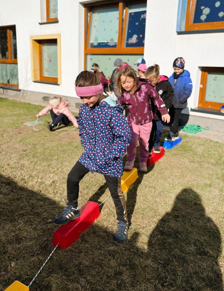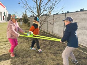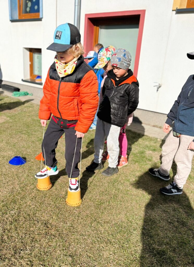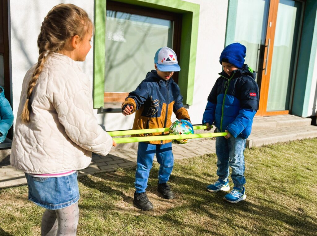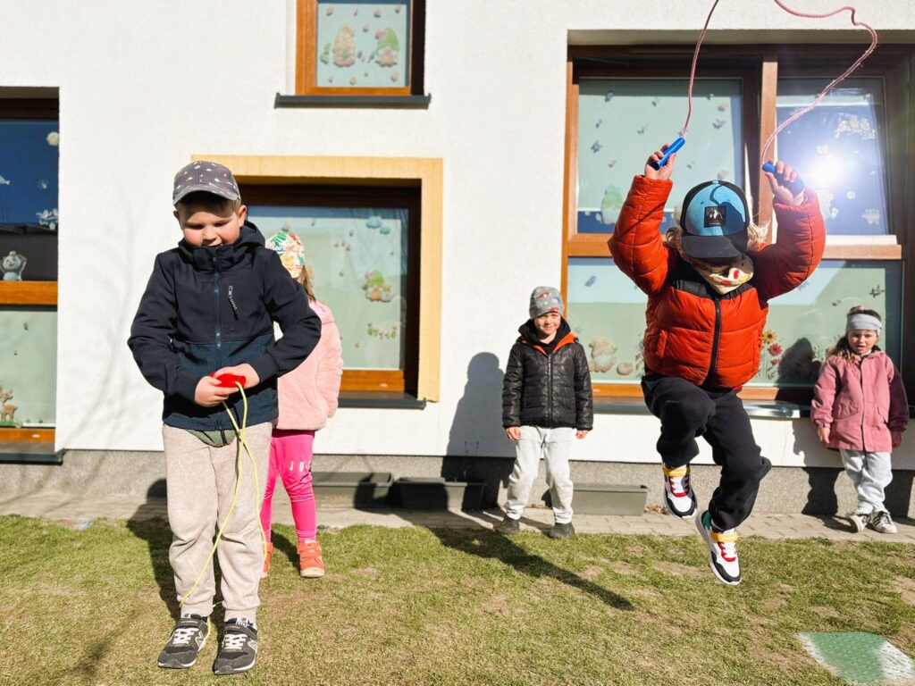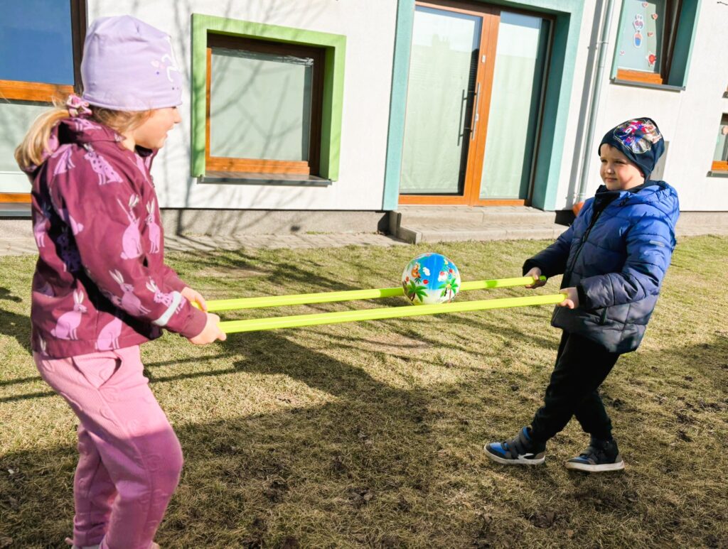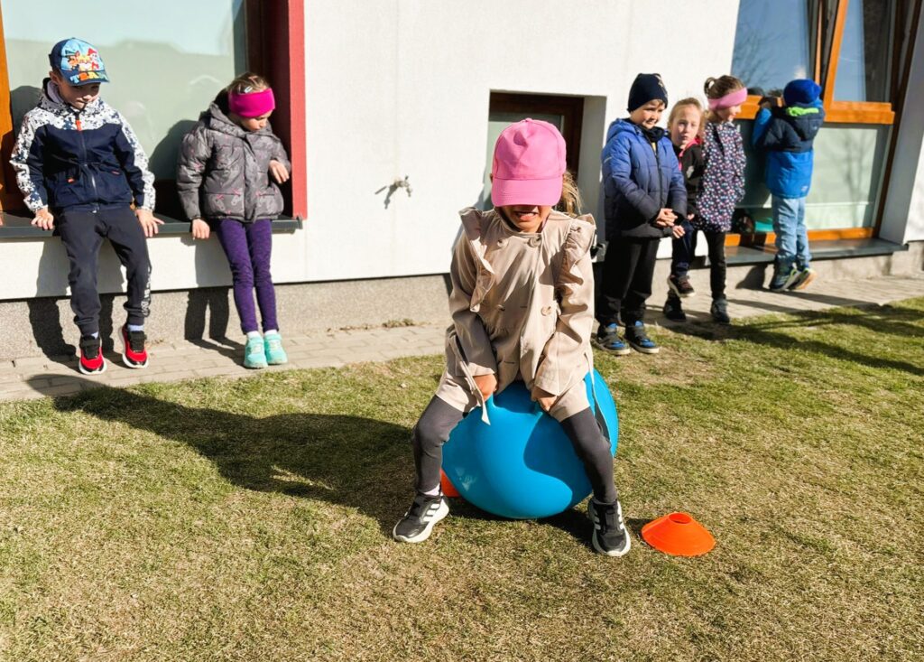 Zajęcia sportowe na świeżym powietrzu dostarczyły Bystrzakom mnóstwo emocji! Najpierw mali sportowcy zmierzyli się z torem przeszkód – było skakanie, zadania w parach, chodzenie na szczudłach i nauka równowagi. Następnie przyszedł czas na zbijaka – dzieci ćwiczyły refleks, celność i współpracę w drużynie. Aktywność na świeżym powietrzu to nie tylko zdrowie, ale też doskonała okazja do rozwijania sprawności i integracji w grupie! 🙂